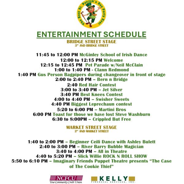 To host an unforgettable party, live entertainment is a must. We have 2 stages this year, first at 3rd and Bridge Streets and Second at Market and 3rd. We have a fantastic lineup which includes live Irish music, rock n roll, dancers, magicians, puppet show, live theatre and much much more. Downloadable full schedule listed on the information page.